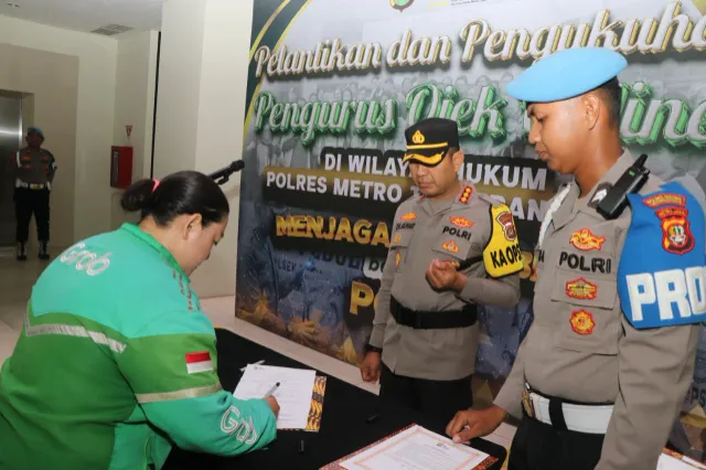 Tangerang – Polres Metro Tangerang Kota resmi melantik dan mengukuhkan kepengurusan Komunitas Ojek Online (Ojol) Kota Tangerang, Selasa (23/9/2025) pagi. Kegiatan dipimpin langsung Kapolres Metro Tangerang Kota, Kombes Pol Dr. Raden Muhammad Jauhari, SH, SIK, M.Si, bertempat di Lobby Polres Metro Tangerang Kota, Jl. Perintis Kemerdekaan.