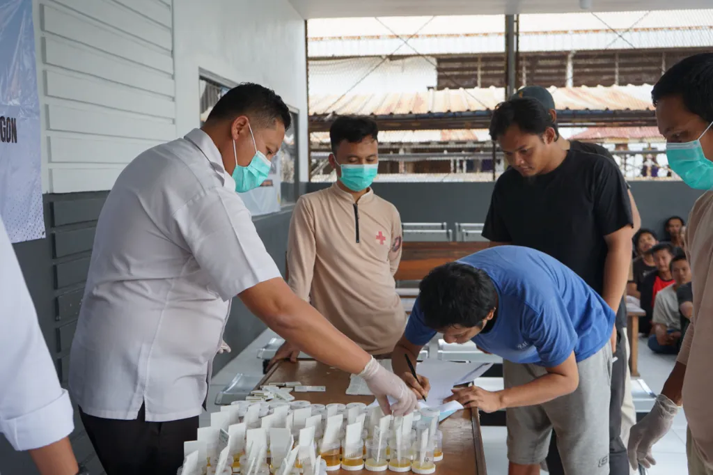 Cilegon, INFO_PAS — Dalam rangka mendukung program Pencegahan dan Pemberantasan Penyalahgunaan dan Peredaran Gelap Narkoba (P4GN), Lembaga Pemasyarakatan Kelas IIA Cilegon melaksanakan kegiatan tes urine bagi petugas dan Warga Binaan Pemasyarakatan (WBP), bertempat di Klinik Pratama Lapas Cilegon, Rabu (29/10).
